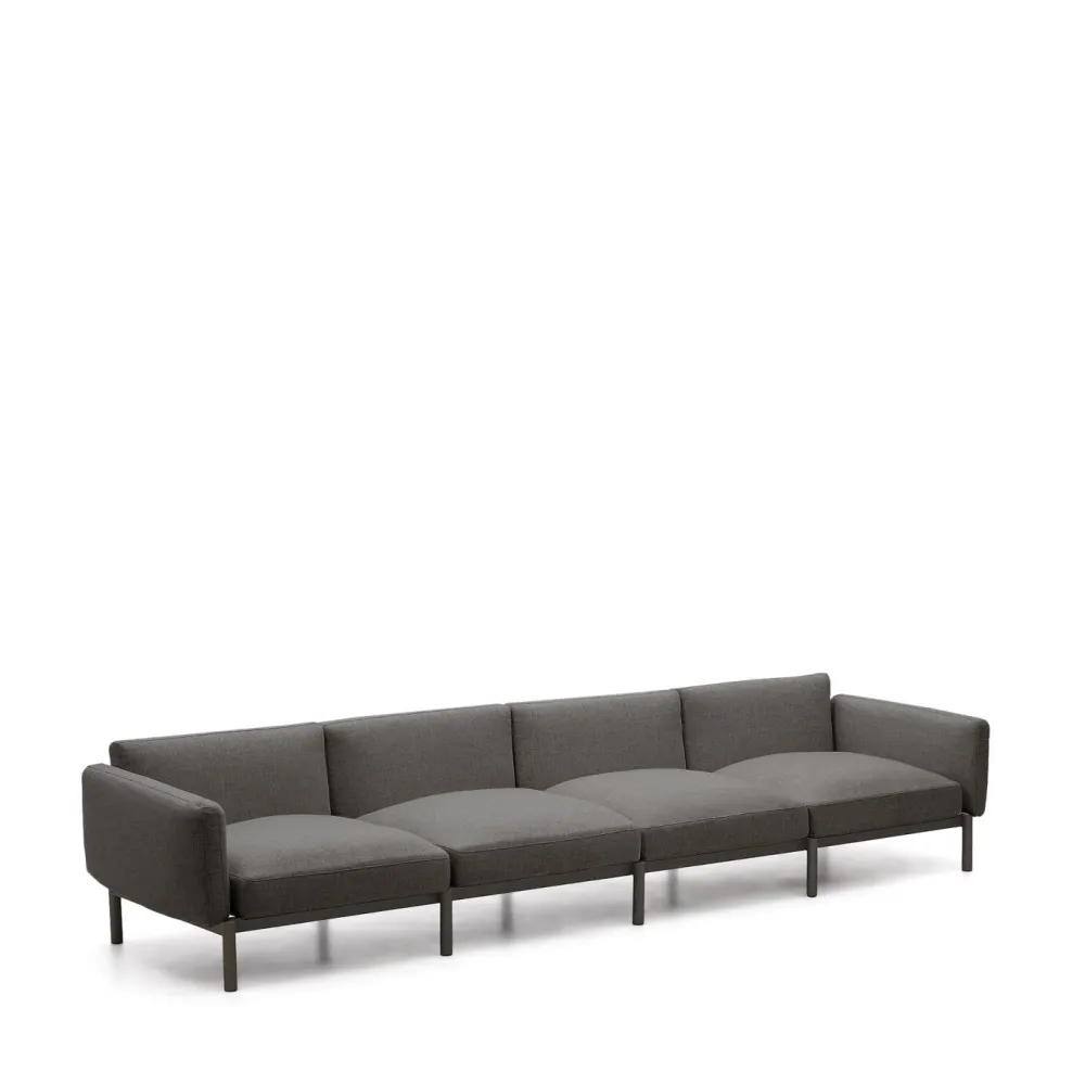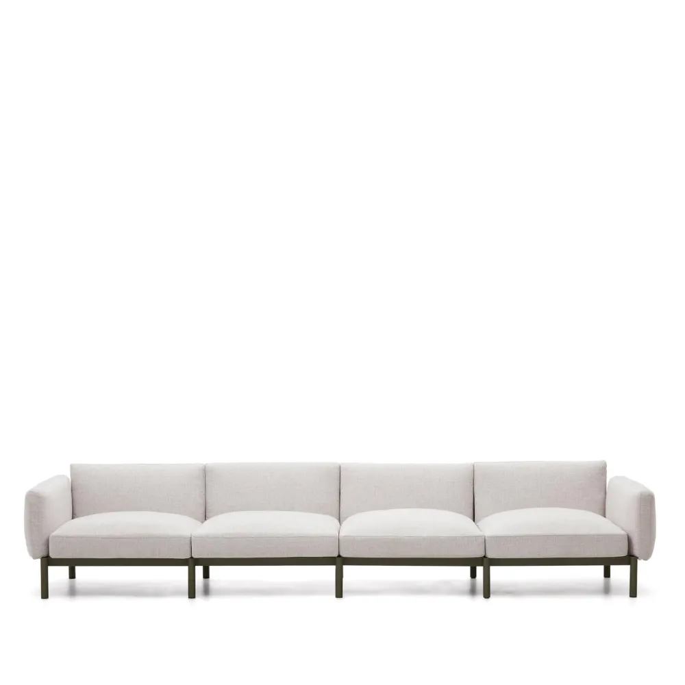 - Sorells modulaire beige beklede 4-zitsbank voor buiten met aluminium structuur met afwerking in grijs.