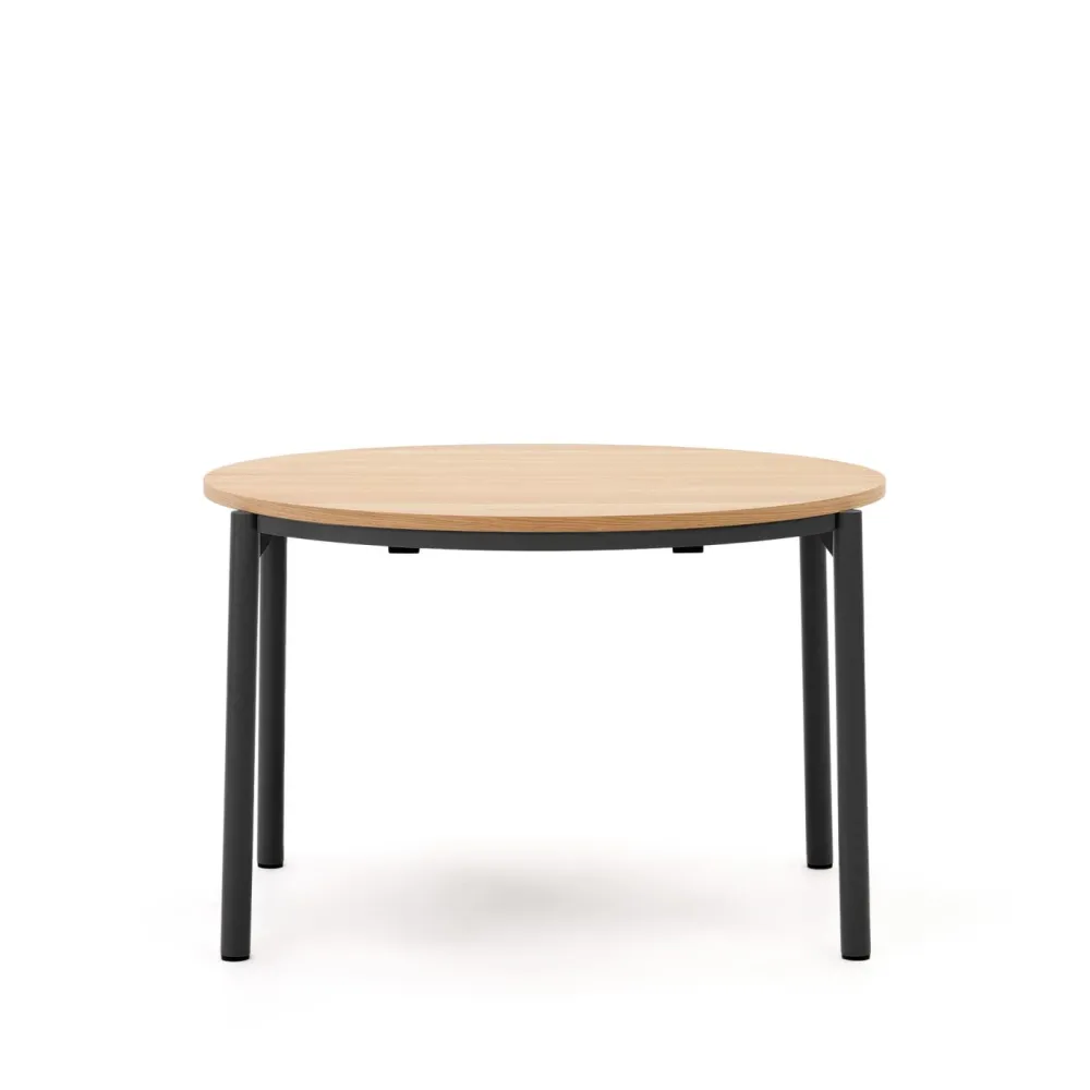 - Ronde uitschuifbare tafel van eikenfineer en stalen grijze poten.