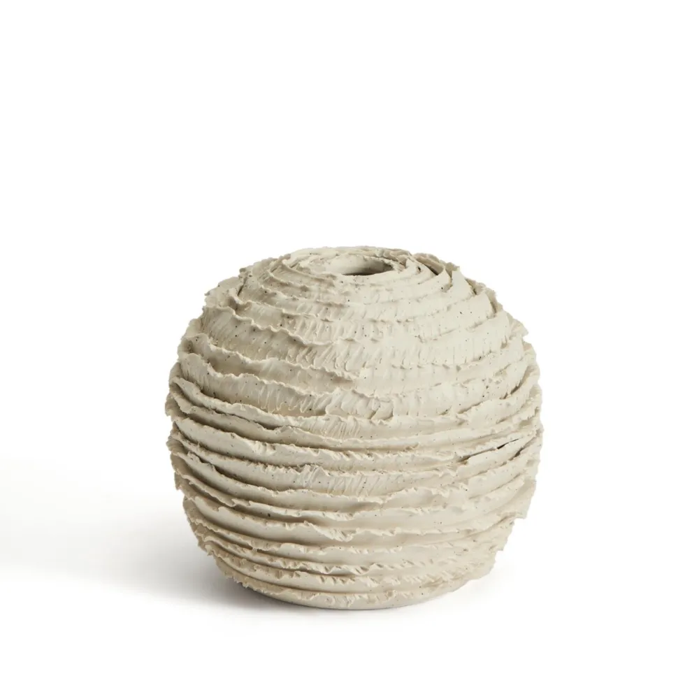 De Evania-collectie is met de hand vervaardigd op een draaischijf, wat elke vaas karakter geeft en een uniek stuk maakt. Het oppervlak heeft fijne horizontale groeven die de hele vaas omringen, en zorgen voor een spel van licht en textuur dat authenticiteit uitstraalt. De afgeronde, organische vorm nodigt uit tot contemplatie en brengt visuele balans in elk interieur. Perfect om bloemen in te presenteren of als op zichzelf staand decoratief object.