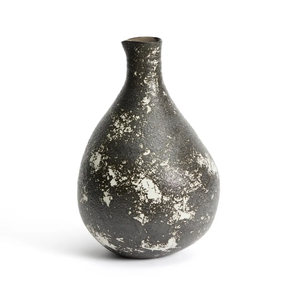 De Orelin collectie is met de hand gemaakt, waardoor elk stuk uniek en onherhaalbaar is. De organische vorm met zachte lijnen en brede basis zorgt voor visueel evenwicht en karakter. De zwarte glazuurlaag met witte nuances creëert een elegant, eigentijds effect met een aangename textuur. Dankzij het glazuurproces heeft elke vaas subtiele verschillen in kleur en afwerking. Perfect met droogbloemen of als decoratief object op zich.