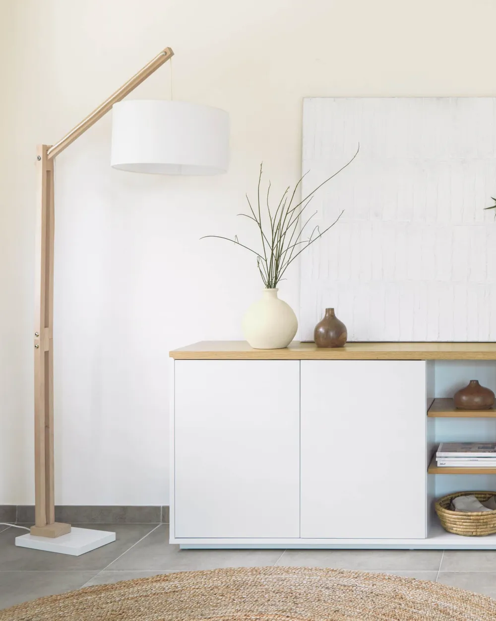 Staande lampen met voet van hout en basis van metaal. Kap van katoen. Voor E27-lamp niet inbegrepen.