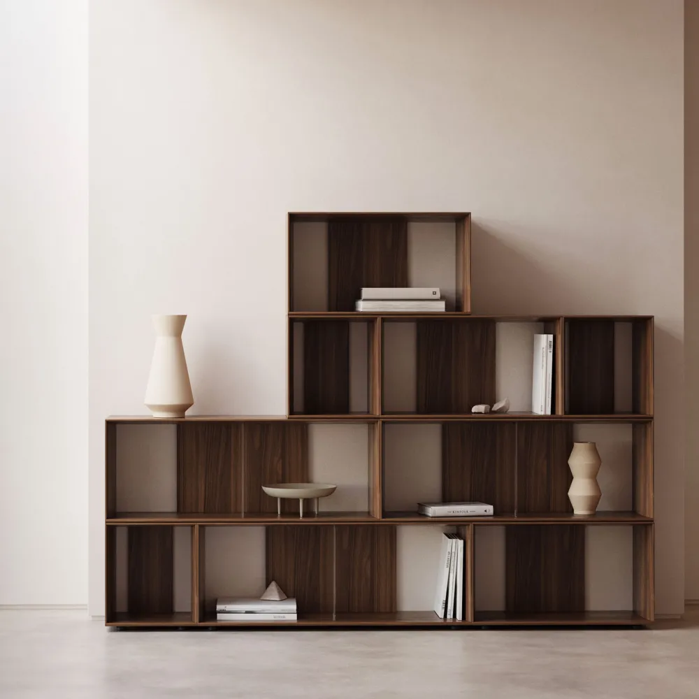 - Set van 3 kleine modulaire planken, 3 middelgrote modulaire planken en 3 grote modulaire planken in eikenfineer.