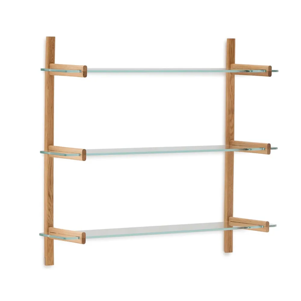 - Planken van gehard glas en massief eikenhouten frame.