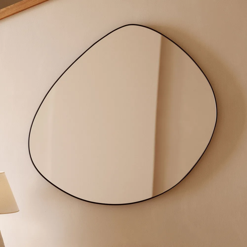 Spiegel ‘Anera’ van Kave Home is een elegant vormgegeven organische spiegel met een subtiel stoere uitstraling. De smalle zwarte rand is vervaardigd uit staal en afgewerkt met een verfijnde poedercoating, wat zorgt voor een matte, moderne look. Dankzij de zachte, asymmetrische vorm voegt Anera een vloeiend en eigentijds element toe aan je interieur.
