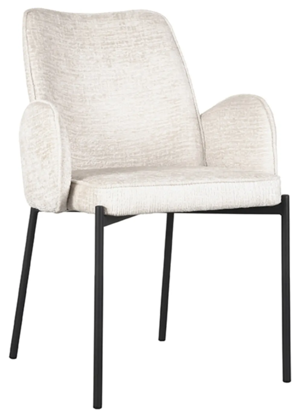 Eetkamerstoel Joni, uitgevoerd in beige elegance heeft een luxe ronde zitting, rugleuning en is in het bezit van armleuningen. Deze combinatie maakt Joni een luxe eetkamerstoel met ontzettend veel comfort. De armleuningen lopen achter de rugleuning langs waardoor de eetkamerstoel een uniek uiterlijk krijgt en er ook nog eens ontzettend leuk uitziet aan de achterkant. Dat is natuurlijk een fijne bijkomstigheid als de eetkamerstoelen aangeschoven staan aan tafel. Het ranke maar doorlopende zwarte frame waar de zitting als ware op rust geeft de eetkamerstoel een luchtige uitstraling. Het uiteinde van het frame loopt op vier zijdes een klein stukje door wat zorgt voor een speels effect.