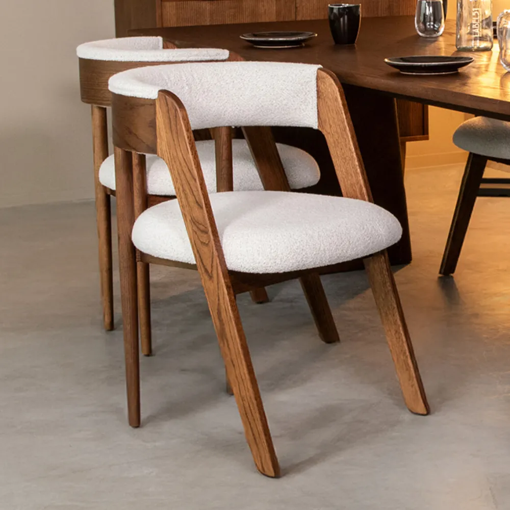 Eetkamerstoel Sasha van LABEL51 is een prachtige aanvulling op elk modern interieur, met een bijzondere affiniteit voor Japandi en minimalistische stijlen. Het frame is vervaardigd uit hoogwaardig Walnoot Eiken wat niet alleen warmte, maar ook duurzaamheid met zich meebrengt. De bekleding uitgevoerd in Ecru Boucle voegt een subtiele textuur toe en creëert een sfeer van ingetogen luxe.