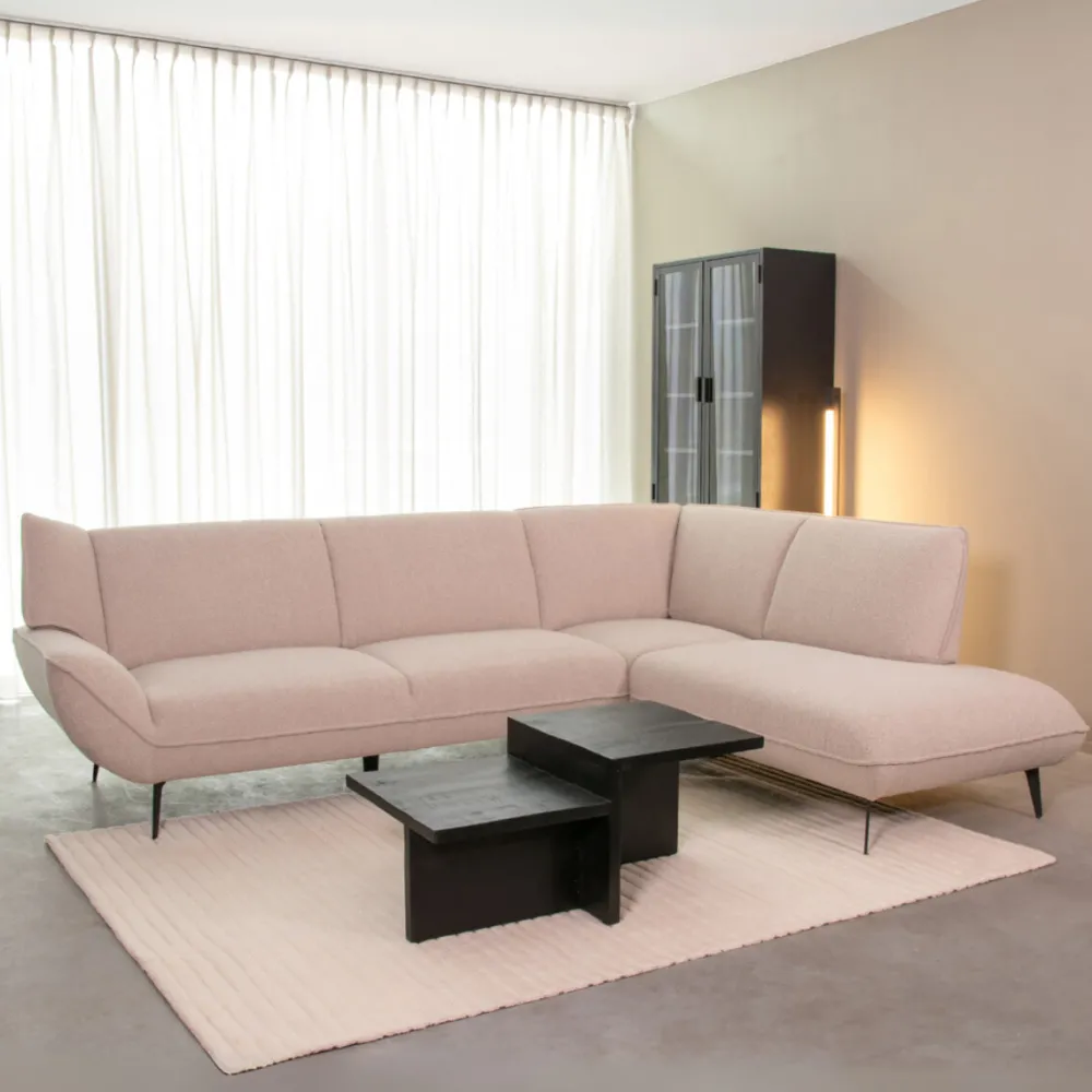 De opstaande armleuning van de hoekbank en de zwart metalen poten geven een moderne twist aan de hoekbank. Dit zorgt niet alleen voor een stijlvolle bank, maar ook voor extra steun en comfort.