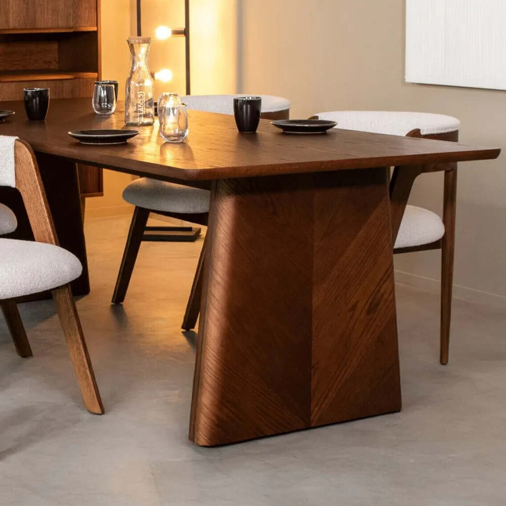 Eettafel Jule van LABEL51 is een hoogwaardig meubel uitgevoerd in walnoot kleurig eikenfineer. De elegante vormen van de tafel vormen een strak en stijlvol geheel.