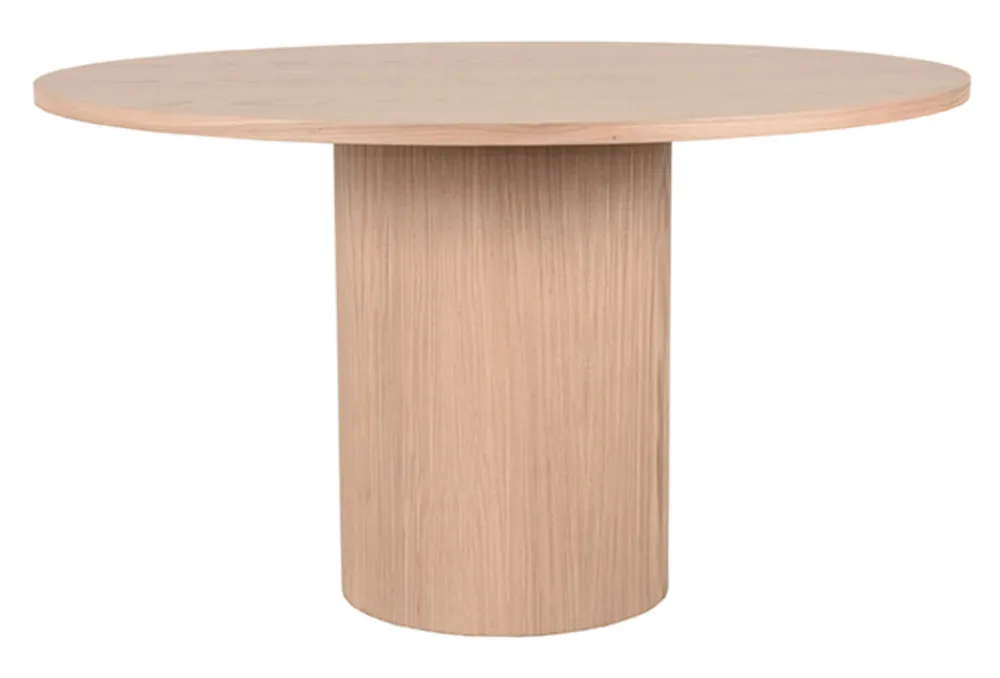 Eettafel Oliva heeft een rond tafelblad dat rust op een cilindervormige poot. De horizontale latjes op de poot geven de tafel een luxe look. Deze tafel past perfect in een modern en minimalistisch interieur.