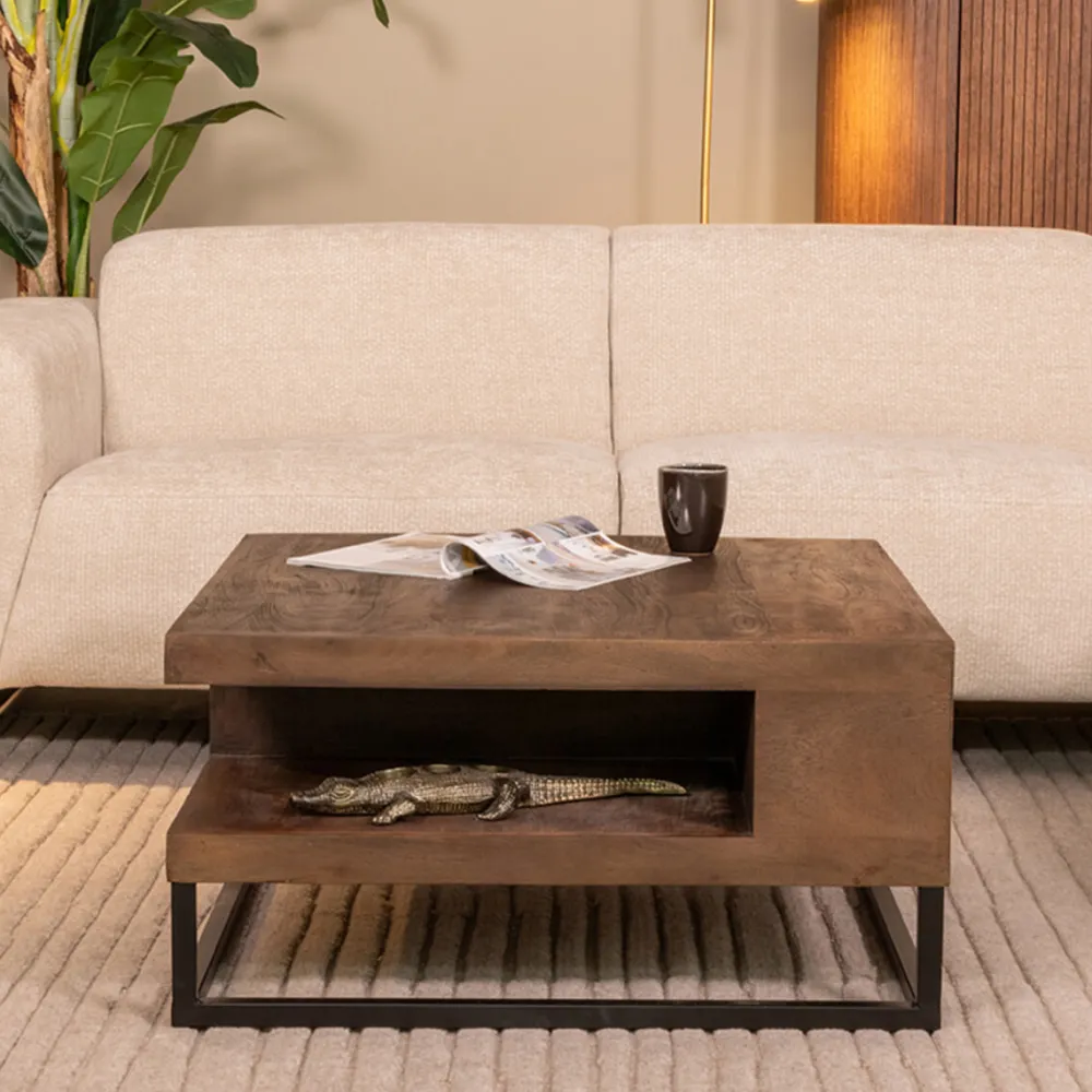 Salontafel Cube heeft een vierkant gevormde basis, gemaakt van zwart mangohout. Deze robuuste basis heeft een prachtige geïntegreerde vakkenindeling die ervoor zorgt dat Cube wel een heel leuk uiterlijk krijgt. Daarnaast zorgt de indeling dat spullen niet direct in het zicht liggen, maar je deze wel lekker bij de hand hebt. De vakkenindeling is aan beide zijdes, in tegengestelde positie geplaatst waardoor het meubel er aan alle zijdes speels en gaaf uitziet. Onder de basis is een sterk zwart metaal frame geplaatst die het meubel voorziet van een luchtig karakter en tevens zorgt voor maximale stabiliteit en stevigheid.