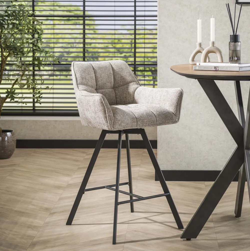 Deze stijlvolle draaibare barstoel met een metalen onderstel voegt een modern accent toe aan ieder interieur. Verkrijgbaar in drie verschillende stoffen en meerdere kleuren, biedt deze barstoel niet alleen comfort, maar ook veelzijdigheid. Combineer de stoel met de bijpassende eetkamerbank en eetkamerstoel. De stoel is per 2 stuks verpakt.