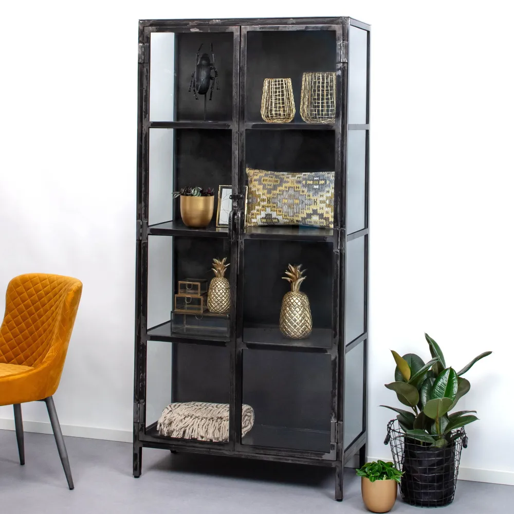 Deze vitrinekast heeft veel weg van onze Rift-serie. Echter door het veelvuldig gebruik van gun metal, wordt dit exemplaar Rift Metal genoemd. De vitrinekast is voorzien van 2 glazen deuren en 3 schappen.