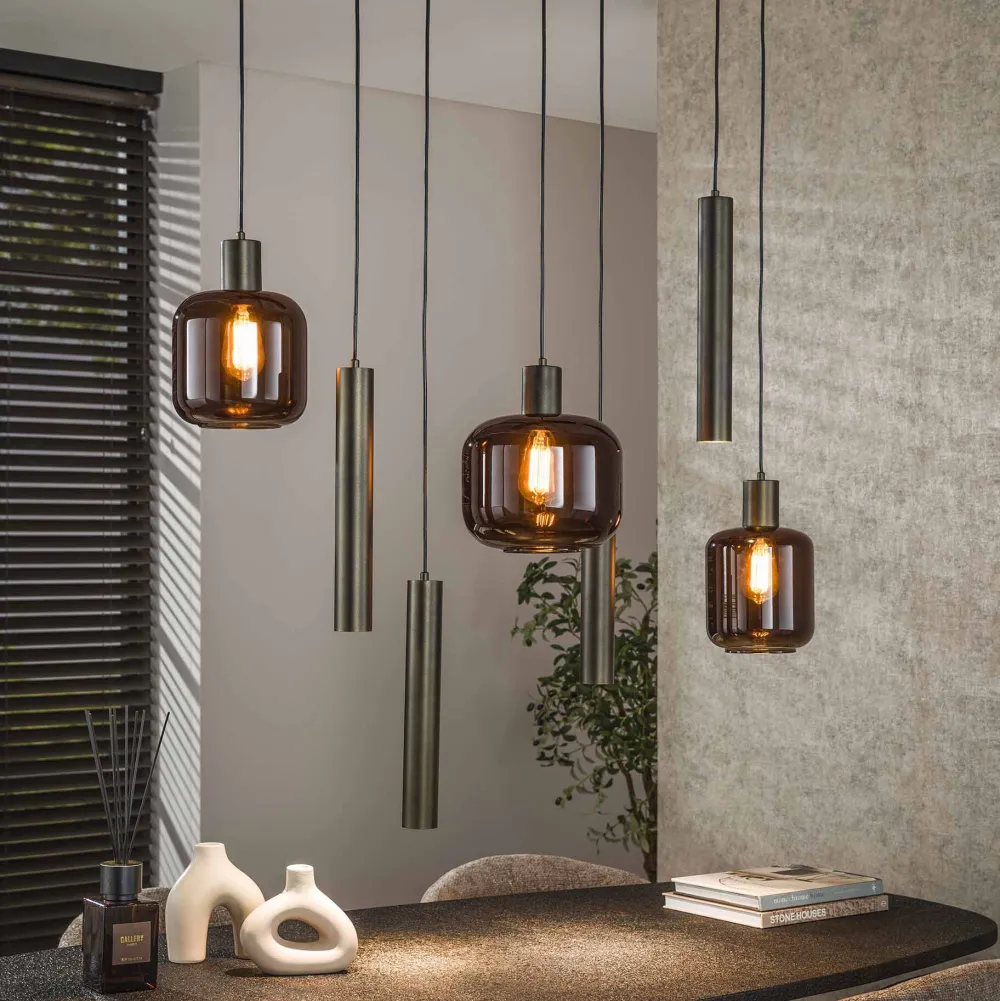 Hanglamp Gill is uitgevoerd met een metalen armatuur in een bronze kleur. Het ontwerp bestaat uit zeven pendels, waarvan vier zijn voorzien van een lange, cilindervormige metalen kap. De overige drie pendels hebben elk een bolvormige glazen kap in een unieke uitvoering. Iedere lamp is afzonderlijk in hoogte verstelbaar tot 150 cm. Voor de lamp zijn vier GU10 LED-lichtbronnen nodig en drie keer E27. De lamp is onderdeel van de Gill-serie.