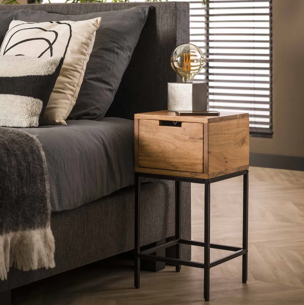 Dit nachtkastje is uitgevoerd in acaciahout. Het nachtkastje heeft een lade en een metalen onderstel. Het nachtkastje heeft een afmeting van 30x30cm en is dus heel compact. Ideaal voor een kleinere slaapkamer!