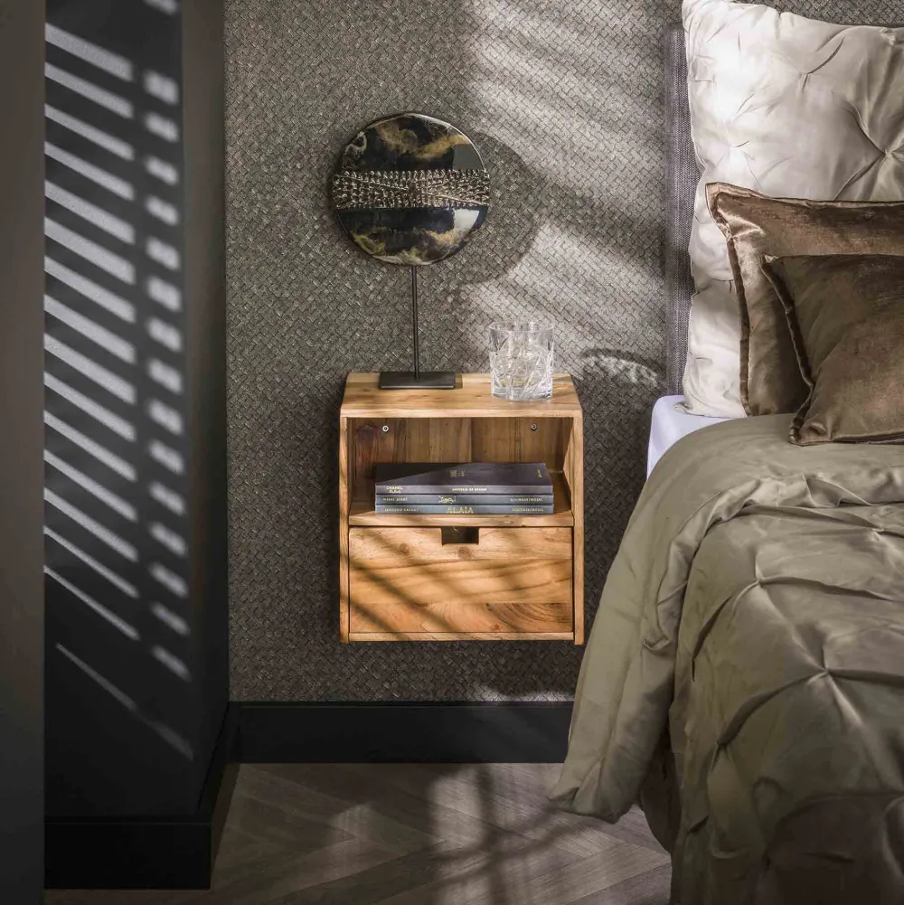 Het hangende nachtkastje ‘Calan’ van LifestyleFurn is een praktische en sfeervolle set van 2 stuks, gemaakt van massief acaciahout. De warme houttint en zichtbare nerf geven elk kastje een natuurlijke en authentieke uitstraling.Calan is voorzien van één lade met een handige opening als greep en een open vak erboven, ideaal om boeken of andere spullen binnen handbereik te houden.