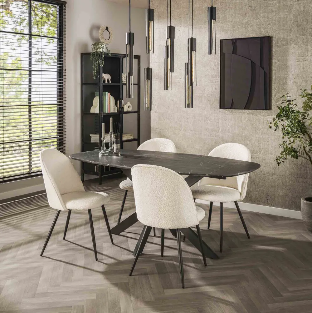 Deze eetkamertafel is uitgevoerd in melamine met een natuursteen uitstraling en een spider frame in staal. Het handgemaakte tafelblad met verjongde rand is voorzien van een laagje melaminehars dat is aangebracht op hout. Het materiaal wordt door hitte en druk aangebracht. Het prachtige materiaal in combinatie met de deens ovale vorm, geeft een trendy, maar tegelijk ook tijdloze tafel. Deze tafel is verkrijgbaar in drie maten, namelijk 150 cm, 180 cm en 215 cm.
