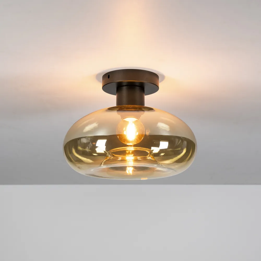 Soll is een plafondlamp met een ronde glazen kap in amberkleurig glas. Het glas zorgt voor een warme lichtuitstraling. H…