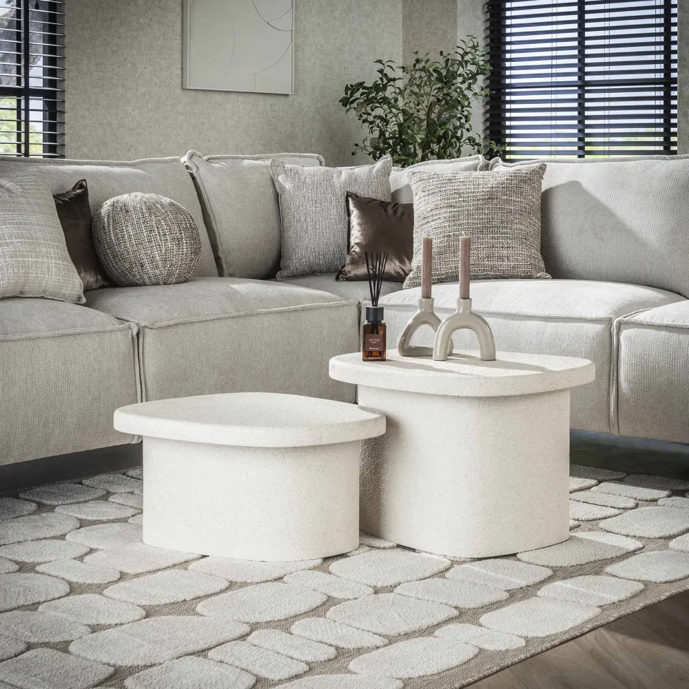 Deze salontafel set van 2 ‘stone organic’ is uitgevoerd in marmer composiet. Het setje van 2 kan naar eigen inzicht bij elkaar gezet worden. Een eigentijdse salontafel met een frisse uitstraling. Het setje bestaat ook in een grotere uitvoering.