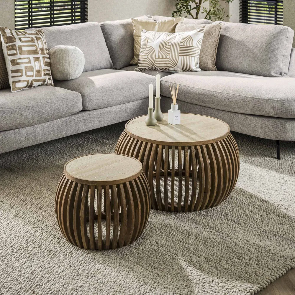 LifestyleFurn Salontafel Set|Travertin Salontafel|Ronde Salontafel Beckie Mangohout en travertinlook, Set van 2 stuks Massief mango zandkleur