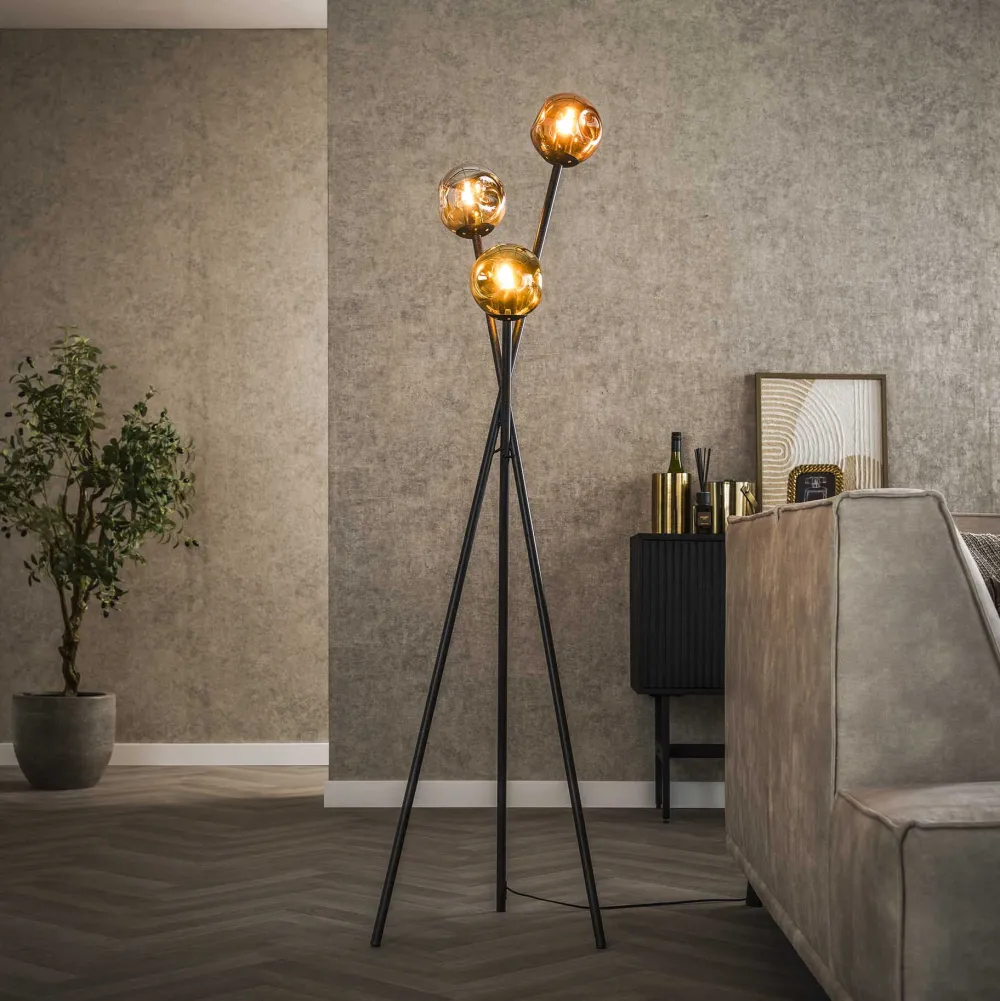 LifestyleFurn Vloerlampen|Vloerlamp Shahid Glas, 3-lamps Artic zwart