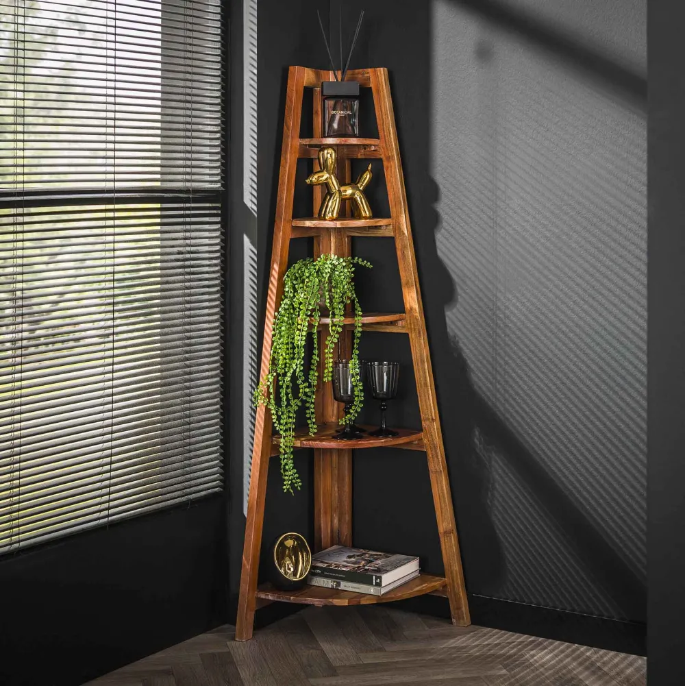 Dit hoekrek is uitgevoerd in mangohout. Het rek beschikt over 5 schapjes. De schapjes beschikken over scharnieren waardo…