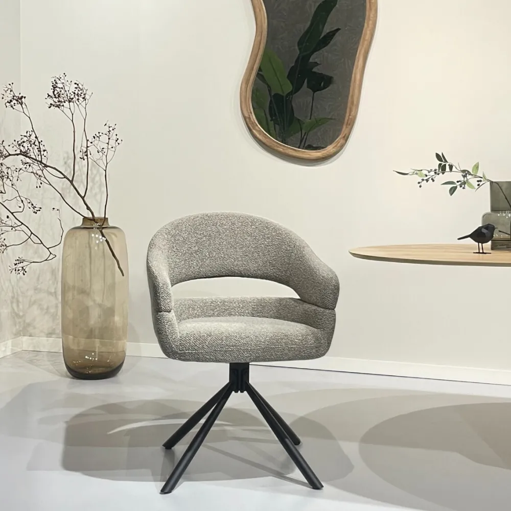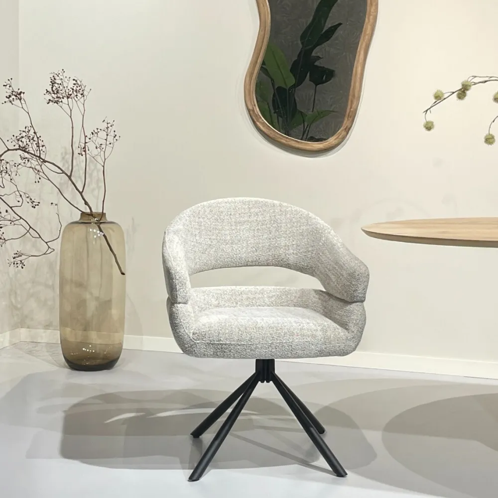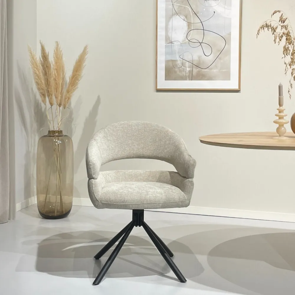 De Linn eetkamerstoel straalt modern comfort uit in een eigentijds ontwerp. De afgeronde rugleuning en het open rugdetail geven de stoel een luchtige en uitnodigende uitstraling. De comfortabele zitting met pocket springs zorgt voor een aangename en goed ondersteunende zit, ideaal voor lange avonden aan tafel. Dankzij het 180° draaibare onderstel ervaar je extra flexibiliteit en gebruiksgemak in het dagelijks gebruik. Zo is de Linn niet alleen bijzonder comfortabel, maar ook een stijlvolle toevoeging aan iedere eetkamer.