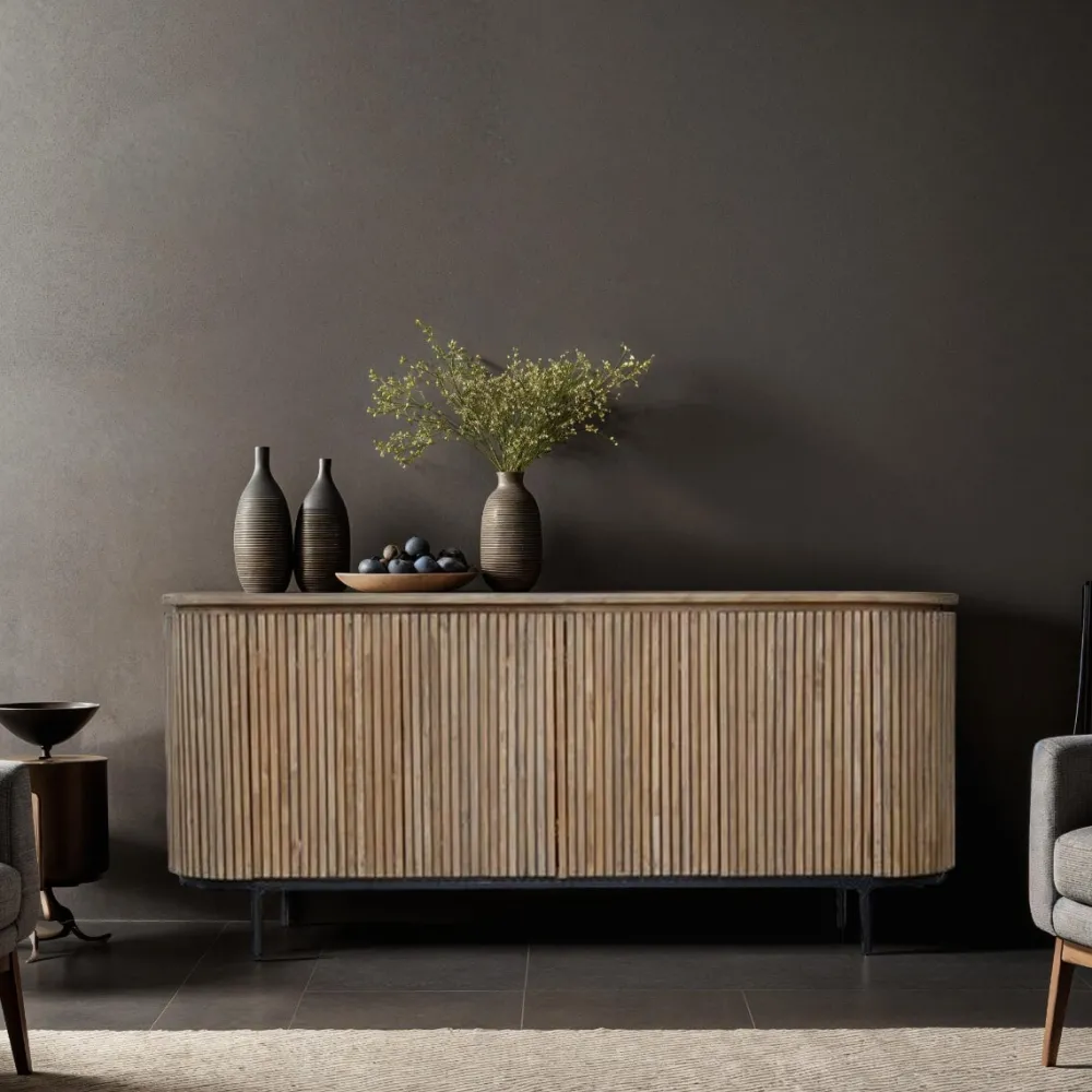Ontdek de verfijnde elegantie van de kasten uit de Lausanne collectie van Livingfurn, een luxueuze kastenlijn vervaardigd uit duurzaam teakhout en voorzien van een slank zwart stalen onderstel. Kenmerkend voor deze collectie is de ovale vorm en het lijnenspel, gecombineerd met de natuurlijke uitstraling van het teakhout en de greeploze deuren die naadloos opgaan in het ontwerp. Deze strakke afwerking zorgt voor een minimalistische look waarbij de natuurlijke schoonheid van het teakhout volledig tot zijn recht komt.