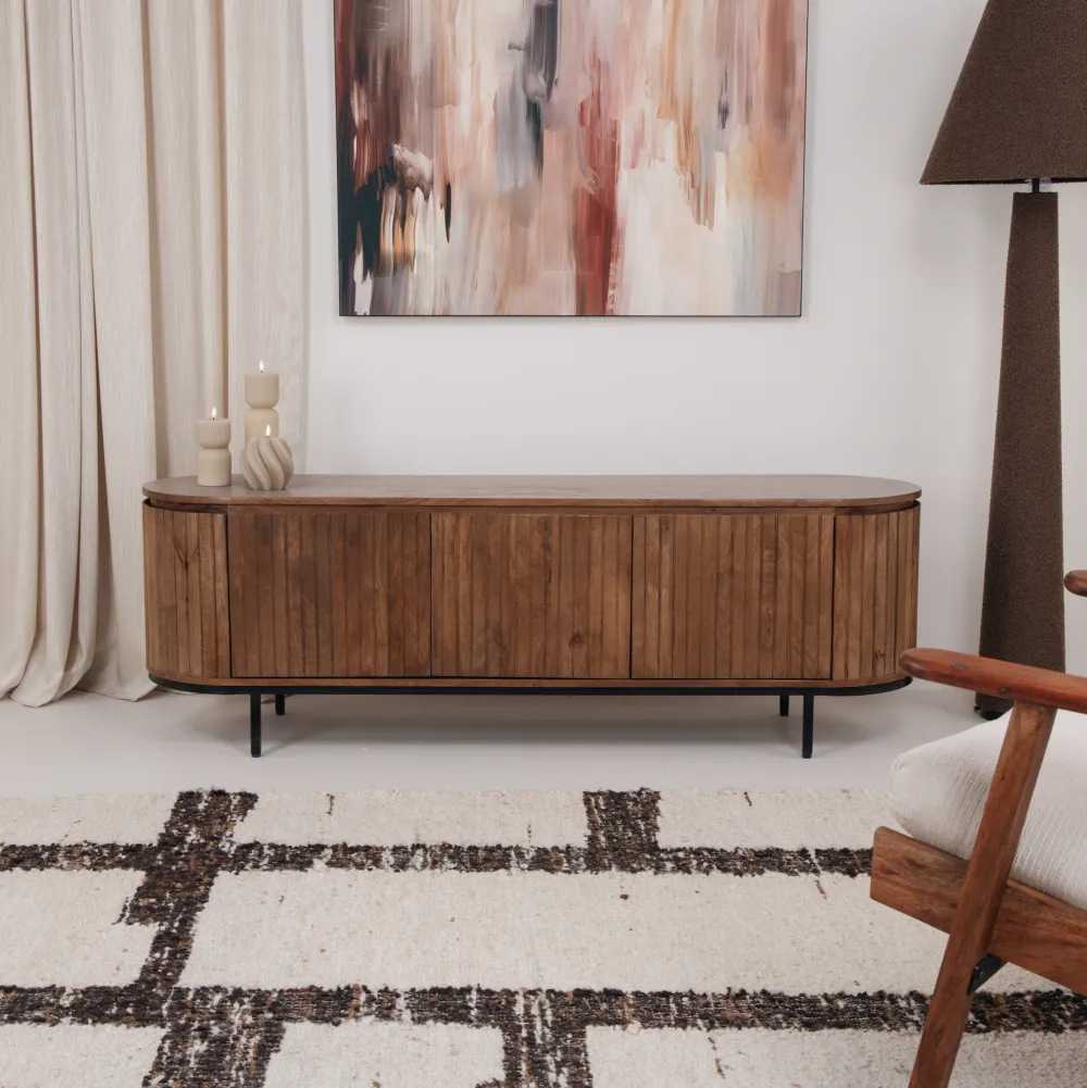 TV-meubel ‘Noor’ van Livingfurn brengt stijl en eenvoud samen. Het warme mangohout met naturel kleurige afwerking straalt een natuurlijke charme uit. De ovale vorm en latjes geven een speels en trendy accent, perfect voor een eigentijds interieur. Met het gecoate stalen onderstel blijft het ontwerp licht en luchtig, terwijl het toch stevig staat.