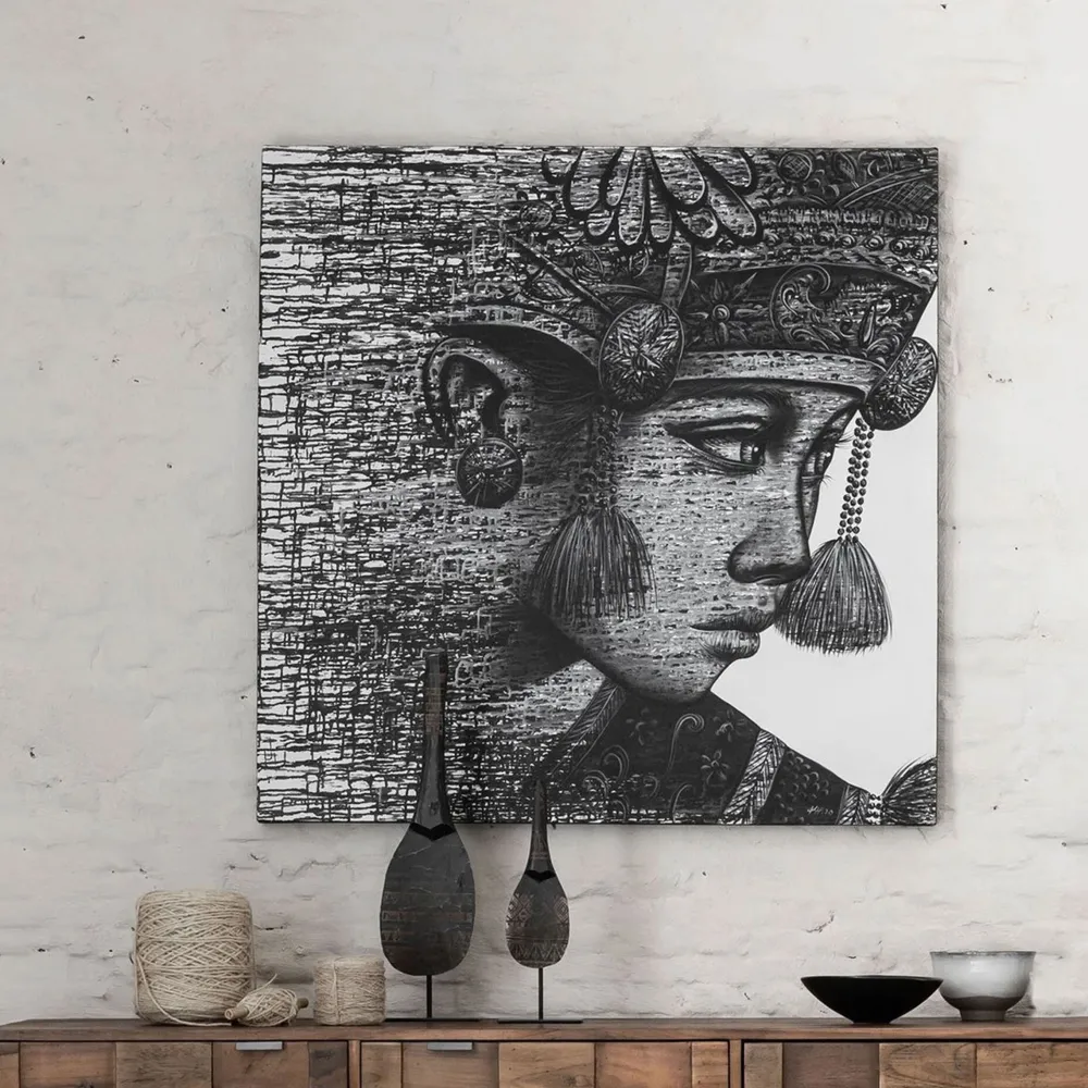 MUST Living Wandpanelen|Wandpaneel Balinese Girl Komang 100 x 100cm Zwart, Wit