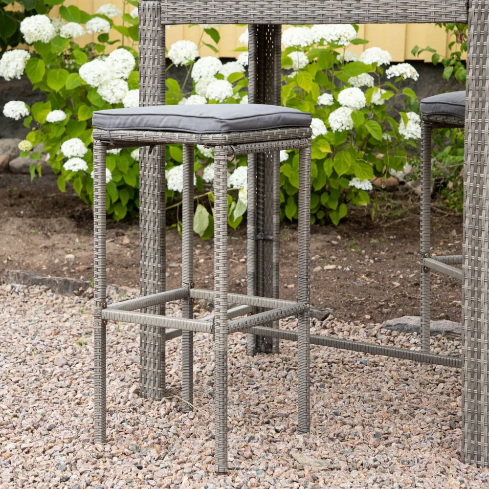 Deze barkruk uit de Rozanne serie is even praktisch als duurzaam! Deze barkruk wordt geleverd in een mooie grijze kleur en is volledig gemaakt van aluminium en synthetisch rotan dat de tand des tijds zal doorstaan. De stoel heeft ook een geïntegreerde voetensteun voor extra comfort. Vul aan met een bijpassende bartafel en richt de patio in met een uitnodigende eetgroep die de patio naar nieuwe hoogten brengt!