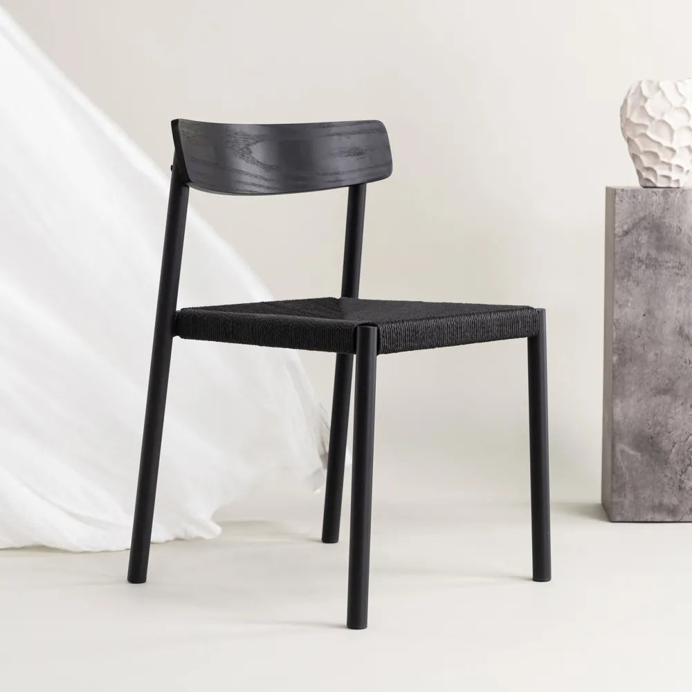 Tyeesha – een klassieke eetkamerstoel in zwart, met een rugleuning van zwart hout en een zitting van duurzaam touw en licht uitlopende poten van metaal. Deze stoel in traditionele uitvoering en Scandinavisch design geeft een moderne uitstraling aan je huis en is gemakkelijk te verplaatsen. Combineer de stoel met je favoriete tafel en je hebt een perfecte plek voor etentjes met vrienden en familie! De stoel is van Nohr.