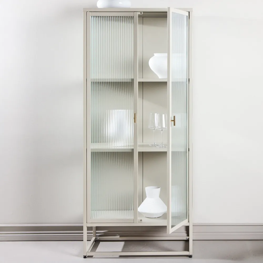 Alieke is een smaakvolle kast die functie en design in perfecte harmonie combineert. Hij heeft twee hoge glazen deuren met een geribbelde textuur, die zorgen voor een geraffineerde look en een prachtig spel van licht en schaduw.