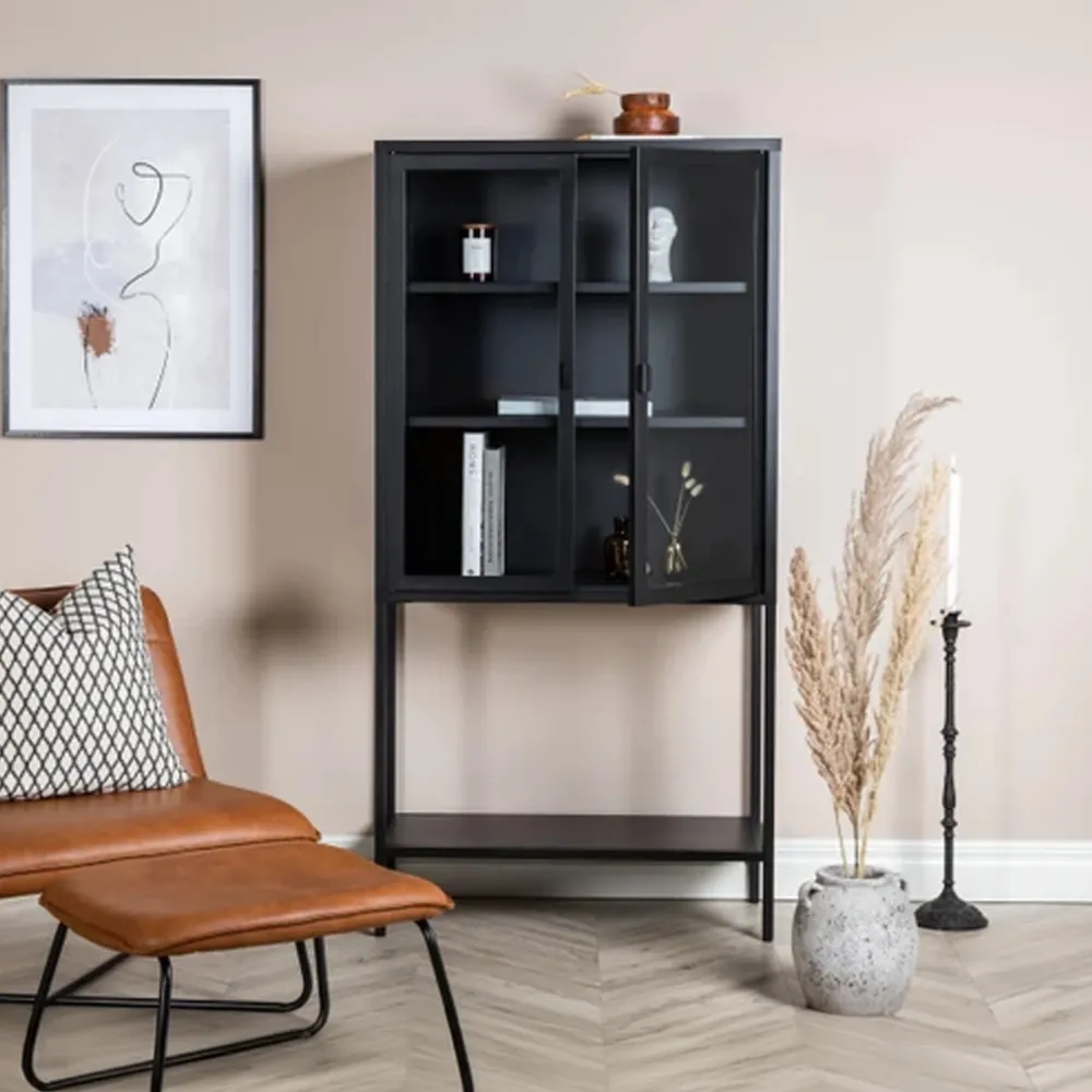 Een elegant opbergmeubel met praktisch en stijlvol ontwerp! Carmilla, in modern Scandinavisch design met rechte structuren, is gemaakt van gepoedercoat zwart staal met twee glazen deuren voor heerlijke lichtinval. De kast heeft een statige hoogte die de kamer opent en een trendy sfeer creëert. Deze vitrinekast is nuttig te veel. Er zijn drie legplanken voor reliëf die je naar eigen behoefte en wens kunt vullen – mooi porselein, boeken of stijlvolle interieurdetails – de keuze is aan jou! Lichtere montage is vereist.