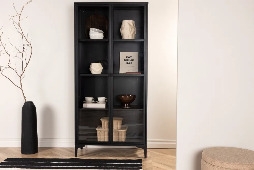 Danyella is een ruime hoge kast van zwart gecoat staal, ontworpen voor wie slimme en stijlvolle opbergruimte nodig heeft. Met twee deuren en een indrukwekkende hoogte biedt hij genoeg ruimte voor alles van kantoorbenodigdheden en boeken tot keukengerei of textiel.