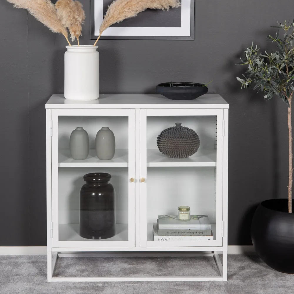 Baktal, in modern industrieel ontwerp gemaakt van wit gepoedercoat staal met twee glazen deuren. Een frame van gepoedercoat wit staal en twee reliëfvlakken. De deuren hebben messingkleurige knoppen. De hele kast rust op een open frame van wit gepoedercoat staal. Afmetingen: Lengte: 85 cm, breedte: 40 cm, hoogte: 85 cm. Lichtere montage vereist.