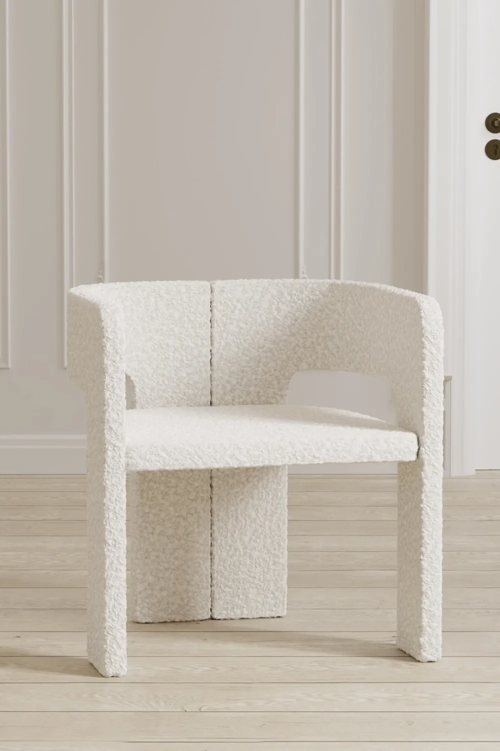 Lyly is een elegante eetkamerstoel met ronde vormen en een moderne uitstraling. De witte bouclé-stof geeft de stoel een luxe en uitnodigende uitstraling die elke maaltijd net iets specialer maakt.