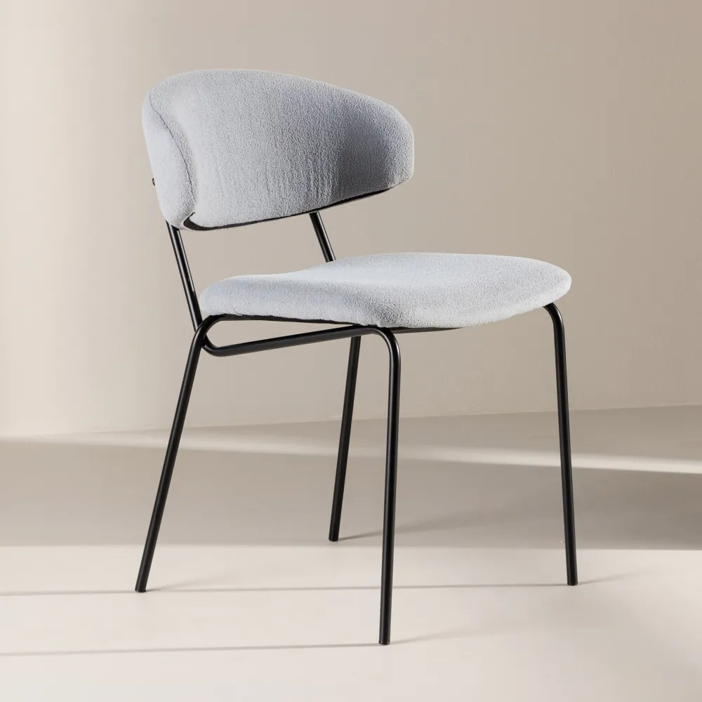 Ontdek Jannet – de elegante stoel die de sfeer van je eetkamer zal verhogen. De zitting van de stoel is bekleed met blauwe bouclé en de poten zijn gemaakt van zwart staal, waardoor een indrukwekkend contrast ontstaat. Jannet wordt geleverd in een handig pakket van twee stoelen.
