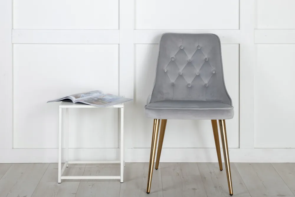 Richt het hart van je huis in met eetkamerstoelen uit de Velvet Luxe serie voor een eleganter middelpunt in de woonkamer! De stoel heeft een volledig gestoffeerd ontwerp in strak grijs fluwelen stof met knopen en decoratieve stiksels in de rugleuning voor een stijlvol detail. Poten van met messing afgewerkt metaal en zachte vulling in de rugleuning en zitting voor extra comfort. Enige montage vereist. Creëer een modern middelpunt