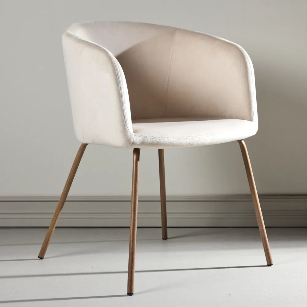 Creëer een blikvanger die indruk maakt met een moderne stoel uit de Karna serie in stijlvolle beige kleur! Deze eetkamerstoel heeft een volledig aangekleed ontwerp met een licht afgeronde rugleuning en zitting in fluwelen stof en polyester linnen en smalle krukpoten in zwart ijzer – gegarandeerd net zo comfortabel als oogstrelend. Richt het hart van je huis uitnodigend en gezellig in en geniet samen van heerlijke maaltijden! Lichte montage vereist.