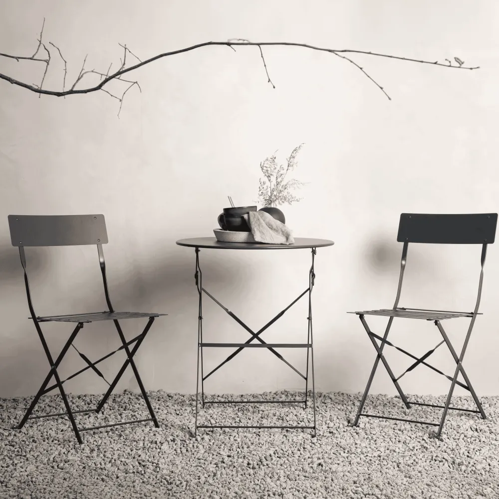 Een nette en gladde bistroset in donkergrijs die gemakkelijk kan worden ingeklapt. Zowel stijlvol als praktisch zodat je er andere dingen bij kunt doen als het meubel niet gebruikt wordt. Neem een kopje koffie en geniet hier van de lente tot de herfst!