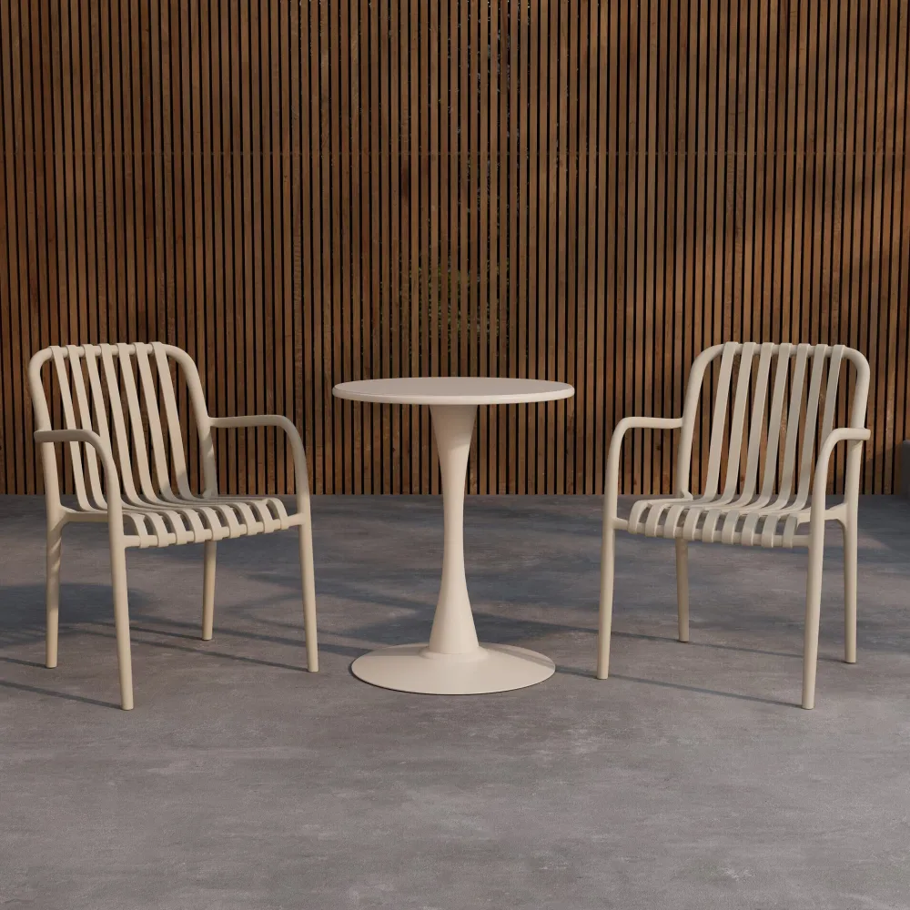 De Takeisha caféset in beige is een stijlvolle en handige oplossing voor je balkon, terras of tuin. De set bestaat uit twee comfortabele stoelen en een ronde tafel in een mooi ontwerp dat zorgt voor een moderne en harmonieuze uitstraling. Door de tijdloze beige kleur past Takeisha makkelijk in verschillende omgevingen en wordt het een gezellige plek voor koffie, ontbijt of een rustig momentje in de zon.