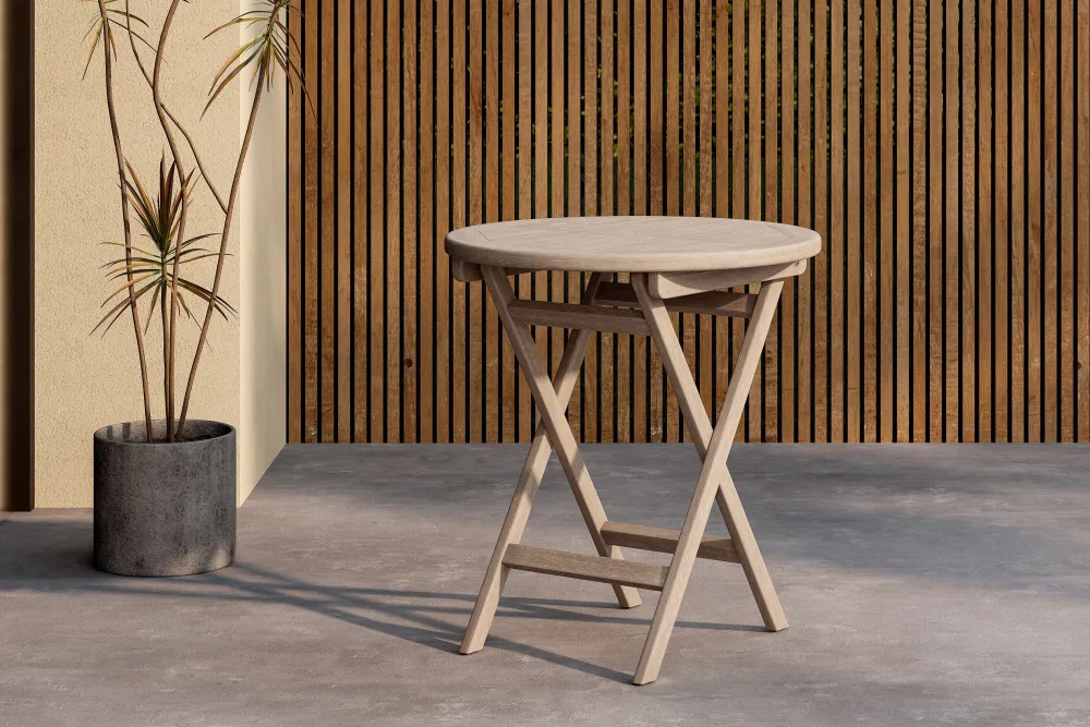 Amberia is een elegante cafétafel met een diameter van 70 cm, perfect voor kleinere ruimtes zoals balkons of gezellige hoekjes op het terras. Hij is gemaakt van duurzaam teakhout met een prachtige whitewash afwerking en combineert natuurlijke charme met modern design.
