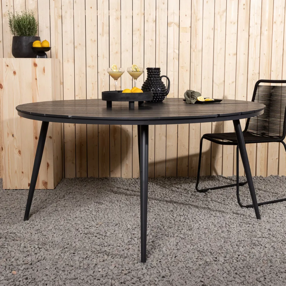 Een ronde eettafel is perfect voor wie een aangenaam, sociaal en uitnodigend gevoel wil creëren voor de buitenruimte of het balkon! Hier kunnen gesprekken en gelach vrijelijk vloeien rond een stijlvolle eettafel in klassieke look. De eettafel heeft een zwart tafelblad van Aintwood en een klassiek onderstel van zwart aluminium – maak je klaar voor het nachtleven en laat de tijd hier het hoogtepunt van de dag zijn!