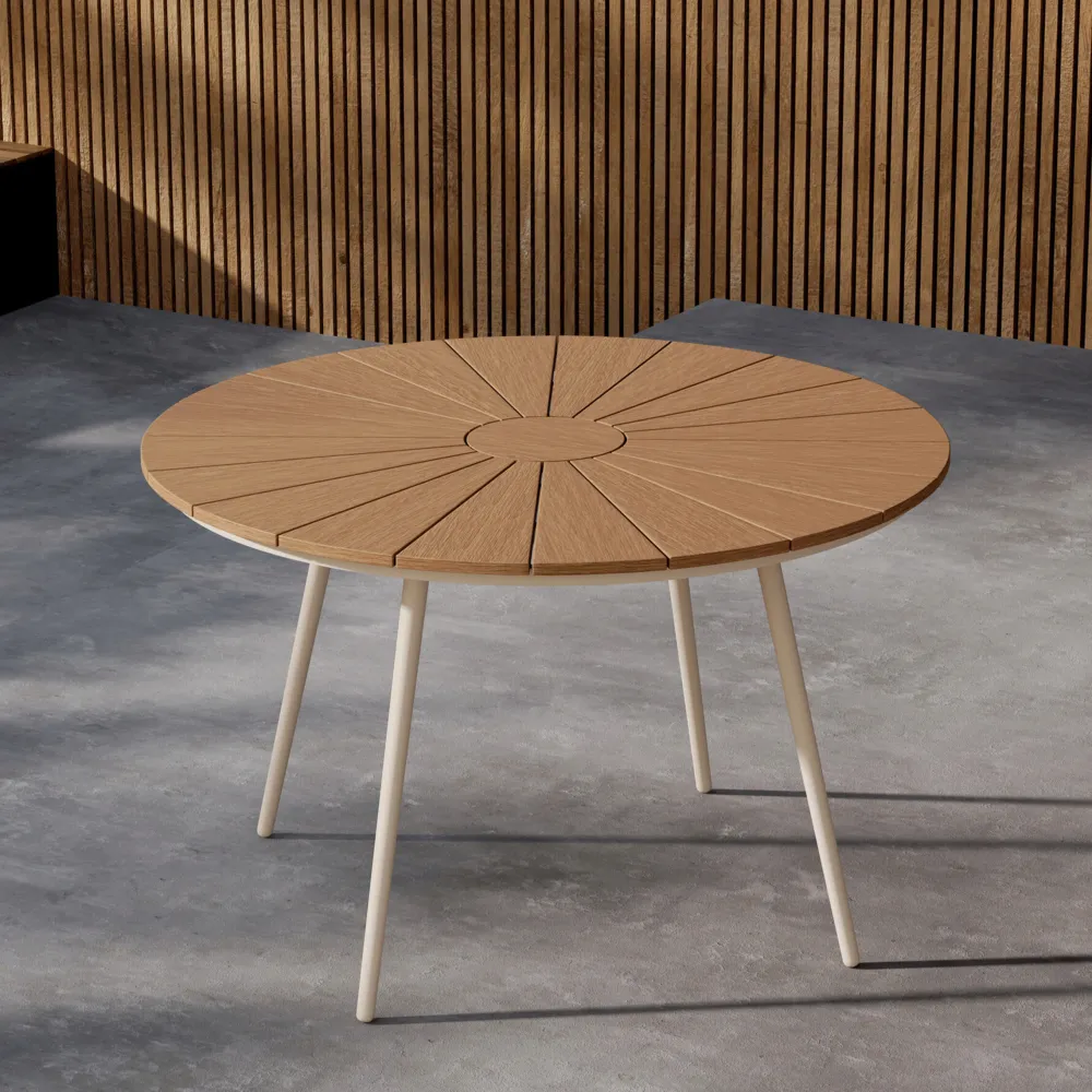 Maak kennis met Perlita – de ronde, elegante tafel die je terras naar een hoger niveau tilt. Met een royale diameter van 120 cm biedt Perlita genoeg ruimte om familie en vrienden samen te brengen voor heerlijke diners in de buitenlucht. De tafel is gemaakt van duurzaam aluminium met een prachtig Polywood tafelblad, dat een perfecte balans biedt tussen lichtheid en stabiliteit. De diepbeige kleur geeft hem een strakke uitstraling die past in elke buitenomgeving en een uitnodigende sfeer creëert. Met Perlita krijg je zowel functie als design – de perfecte keuze om van elk diner een gedenkwaardige ervaring te maken.