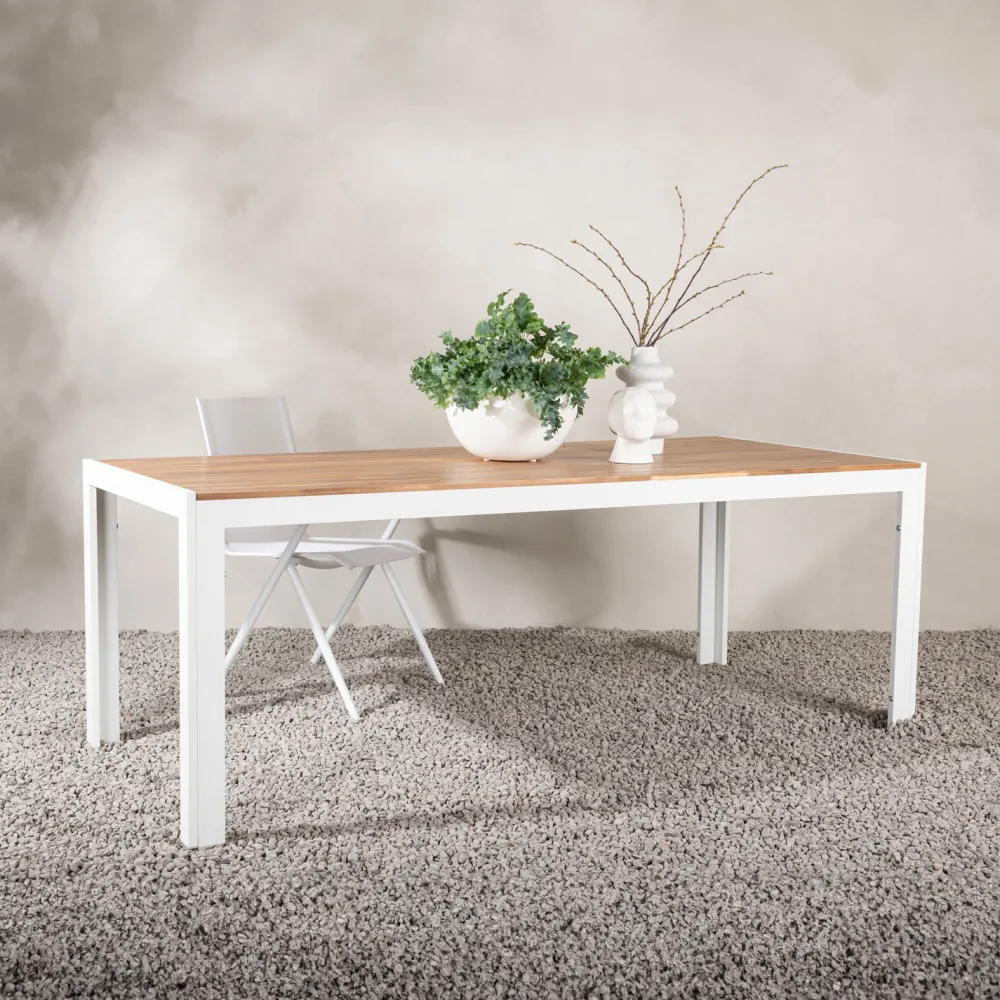 Eettafel Catheryne maakt indruk met zijn rechte Scandinavische vormen en klassieke ontwerp! Het tafelblad is van decoratief acacia en de tafelpoten van stijlvol wit metaal. Combineer met een paar heerlijke eetkamerstoelen zodat je een complete eetgroep hebt om vrienden en familie rond te verzamelen – maak je klaar voor maaltijden buiten en geniet deze zomer van aangenaam gezelschap!