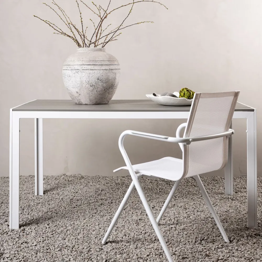 Erikka, onze rechthoekige eettafel voor buiten met een grijs tafelblad van multiplex en witte tafelpoten van aluminium. De aangename kleuren van de tafel geven een warm en uitnodigend gevoel. Het rechte, goed doordachte ontwerp maakt een luchtige en moderne indruk op de patio. Hier heb je een neutrale en charmante eettafel die in de meeste huizen en huishoudens past – werkt geweldig zowel in de tuin als in de buitenruimte!