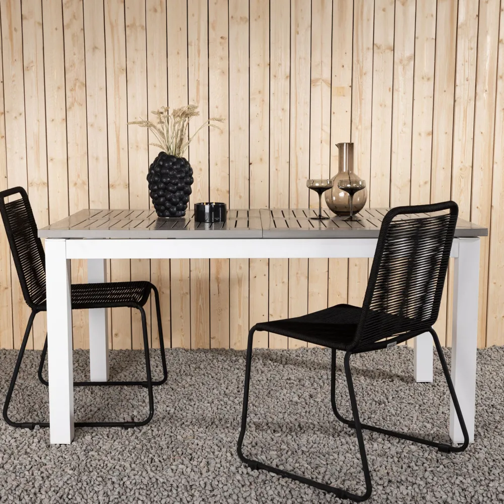 Candise is een uitschuifbare eettafel die iedereen recht heeft – stijlvol, praktisch en tijdloos! Het tafelblad is van grijs Aintwood en de romp van wit aluminium; twee duurzame materialen waarmee je een tafel krijgt die lang meegaat. De rechte Scandinavische vorm maakt een robuuste en strakke indruk. Richt de patio in en creëer een charmant middelpunt om geliefden rond te verzamelen!