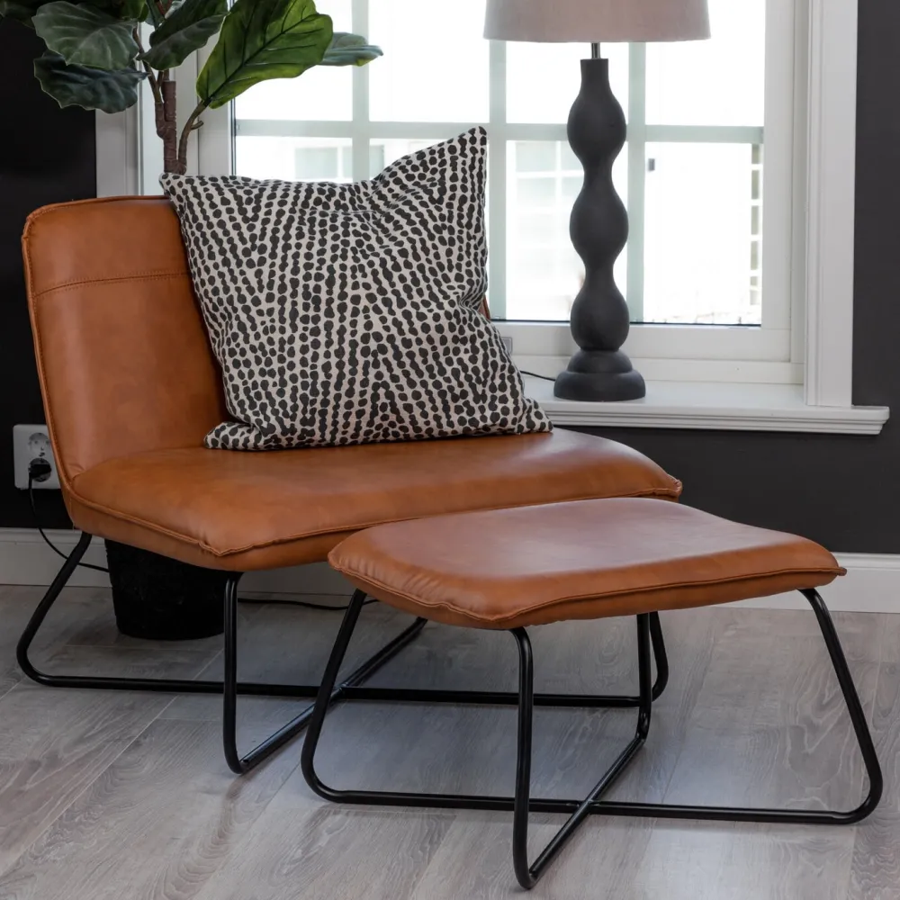 Elegant, stijlvol en klassiek! De Bryony-lounge fauteuil en poef zijn net zo comfortabel als een leuk detail in het interieur. Zet hem alleen als een heerlijk onderdeel van de kamer of laat hem een blikvanger worden met de bankgroep. Het ontwerp is tijdloos met traditionele bruine PU bekleding en elegante zwarte poten in modern vintage. Trakteer jezelf op wat luxe tijd thuis met gestrekte, ontspannen benen in een stijlvolle fauteuil met bijbehorende poef.