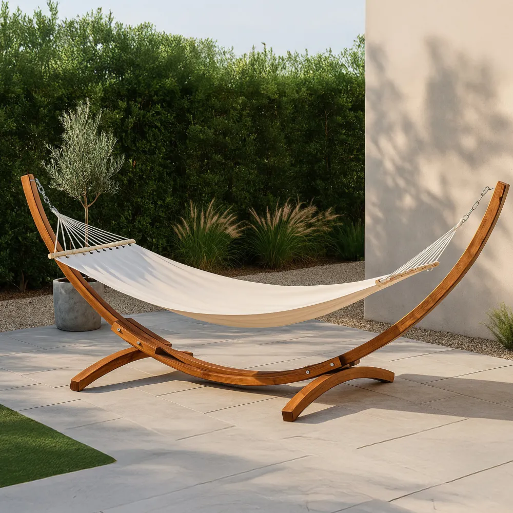 Richt je terras pompeus in met een heerlijke hangmat uit de Delisha serie! Het houten frame geeft de hangmat een luxe uitstraling en klassieke look. De stijlvolle polyester mat in crèmewitte tint geeft de algehele indruk een elegant tintje. Een hangmat voor iedereen gewoon, hier kun je heerlijk ontspannen en genieten van heerlijke zomerdagen in een gezonde buitenomgeving!