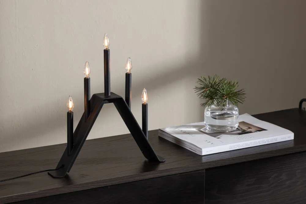 De Barett Advent Kandelaar wordt geleverd met vijf bijgeleverde gloeilampen en geeft een warm en uitnodigend licht. Zet hem op je eettafel, een vensterbank of in de woonkamer om een gezellige en sfeervolle ambiance te creëren tijdens het adventseizoen.